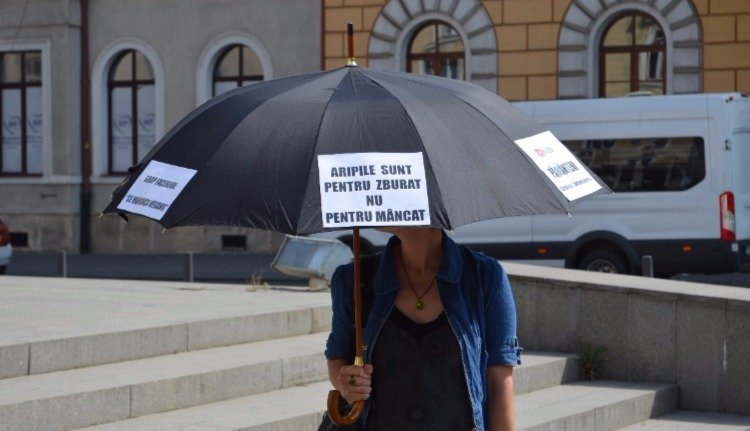 Hogy mi a veganizmus? Röviden, ez. Szóval, ott voltunk, étrendi, etikai és környezetvédelmi vegánok, no meg nem-vegánok, és gyülekeztünk szépen. A Vegan în Cluj-Napoca (Vegánok Kolozsváron) nevű kezdeményező csoport tagjai ijesztő és nagy fotográfiákat osztottak szét a jelenlévők között, amelyek a legkülönbözőbb állatok szenvedését mutatták be, továbbá tájékoztató brosúrákat a veganizmusról.