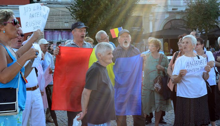 Mintegy 30-40, jobbára nyugdíjas személyes tüntetett Kolozsvár Főterén vasárnap délután. Szlogenjeikben Traian Băsescu államfőt szidták, papírjaikon az Antena 3 hírtelevíziót éltették, miközben a Colours of Cluj fesztivál programjaként ingyen ölelést osztogató, lelkes fiatalok lepték meg az arra járókat.