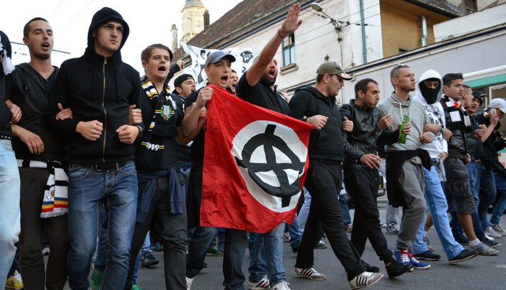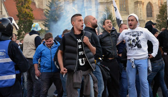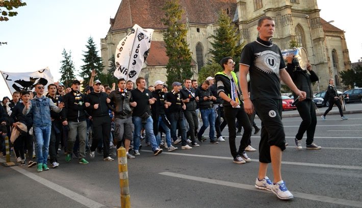 Egész délután a Főtér sarkán, a Deák Ferenc / Eroilor utca elején hangoskodtak az U drukkerei, amíg el nem indultak este a városi rivális, a Kolozsvári CFR fellegvári stadionjába.