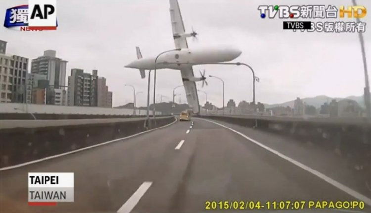 A TransAsia légitársaság két turbóhajtóműves ATR-72-es típusú gépe a tajpeji Szungsan repülőtér közelében bal szárnyával szinte függőleges irányban lelassulva egy hídon közlekedő taxit is érintve a korlátnak ütközött, majd a sekély vizű Kilung folyóba zuhant.