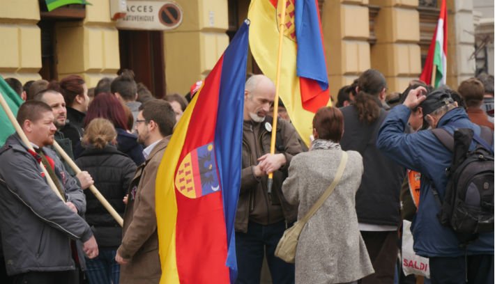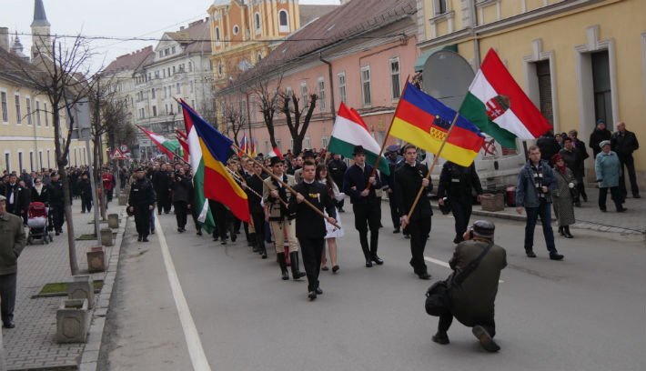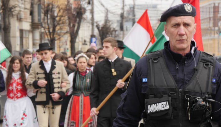 A menet elindul, a Klapka-indulóra. Olyan 1000 ember menetel a Kossuth Lajos utcán. A menet eleje díszmagyarban, népviseletben, egyik nóta követi a másikat, aztán kezdik elölről. A menet nagy része civilben, kokárdásan, vidáman diskurálva. A zászlók szintén felvonulnak, ahogy kell. Ott a román, a magyar, a székely, az erdélyi meg az árpádsávos. A tömegben megbúvik egy vármegyés felségjel is, de nem bontják ki.