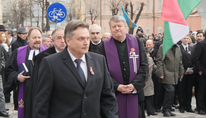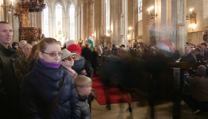 A Főtéren kiderül, hogy korán érkezett a menet, ugyanis az ökumenikus istentisztelet csak fél egykor kezdődik a Szent Mihály-templomban. Horváth Anna alpolgármester asszony rövid megbeszélést tart a csendőrökkel, és a menet elhalad a templom előtt, befordul a térre, megkerüli a Király szobrát, majd menetrend szerint bevonul az Isten házába.