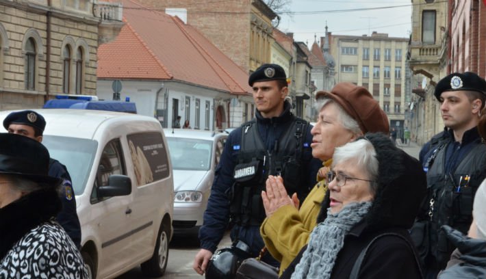 Csendőrök sokasága és román kokárdás ellendrukkerek kísérték a felvonulókat.