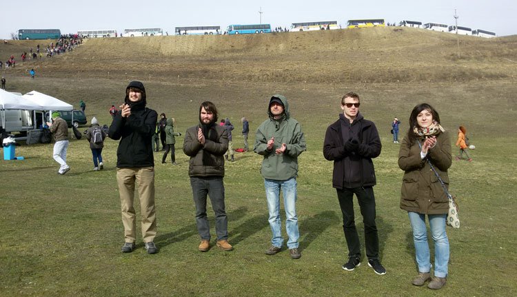 A Jazzybirds a búcsúszámokat játszó zenészeknek tapsol, fejük felett, a kopasznak tűnő domboldalon van az erdőkezdemény egy része, a domb tetején lévő egysávos úton pedig a több mint tíz busz, amely már a hazaútra sorakozott fel.