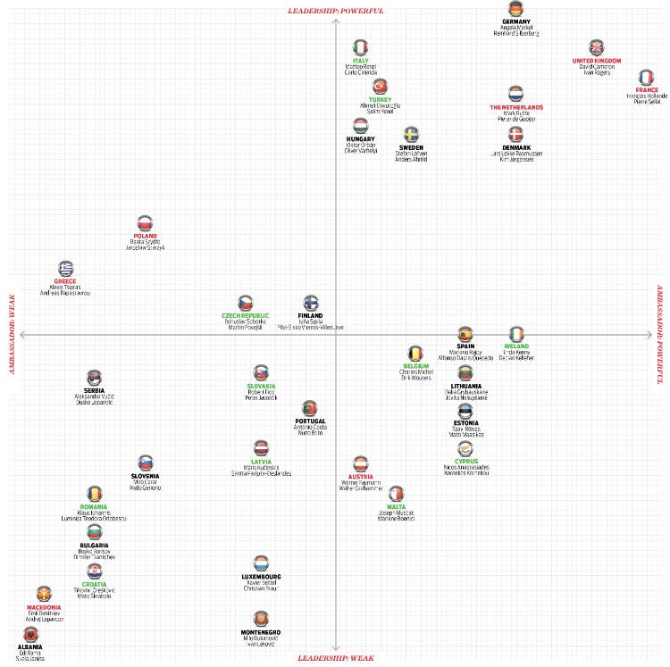 Románia viszont a mátrix legalsóbb fertályába került, Bulgáriával, Horvátországgal, Luxemburggal, Macedóniával, Albániával és Montenegróval együtt – ezen országoknak a vezetése és a brüsszeli képviselete egyaránt nagyon gyengének számít.
