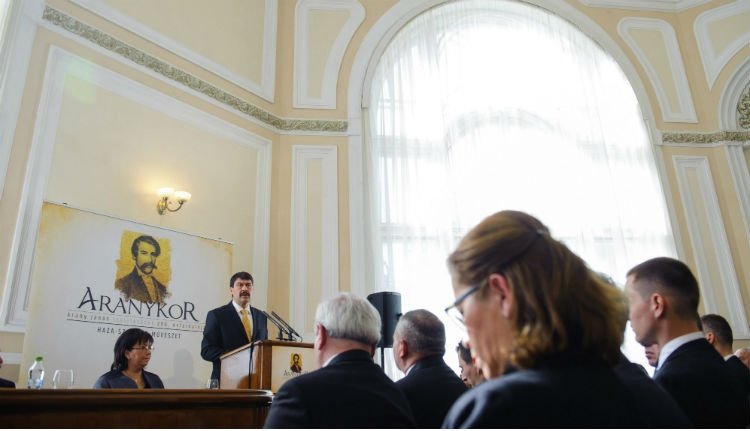 Áder felidézte, hogy amikor Arany Jánost 1867-ben felterjesztették a Szent István Rendre, nemcsak ő maga tiltakozott az uralkodó döntése ellen, de egy főrend is panaszt tett Andrássy Gyula miniszterelnöknél, mondván, ez a jeles kitüntetés addig csak igen magas rangúaknak járt. „Az anekdota szerint Andrássy egy kérdéssel válaszolt: