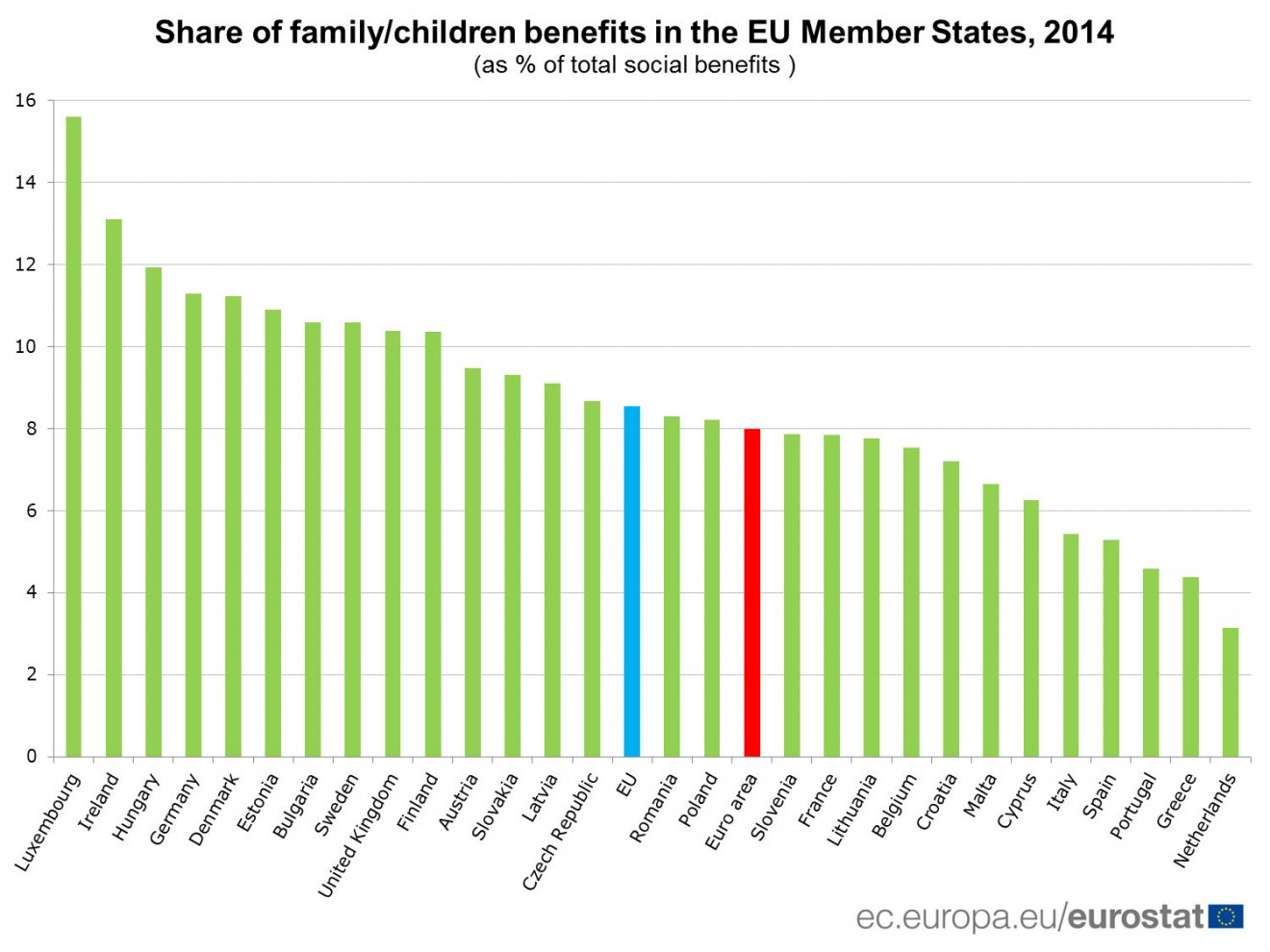 Az EU-ban a szociális szolgáltatásokra szánt összegek 8,6%-át költötték az államok a család- és gyermeknevelési pótlékokra, ennél többet csak az idős személyek számára (45,9%), valamint egészségmegőrzésre és fogyatékkal élő személyeknek szánt pótlékra (36,5%) költöttek a tagországok.