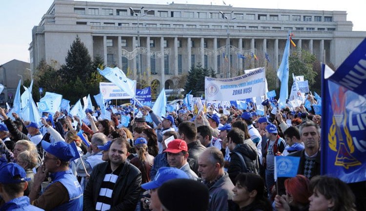 Négy országos szakszervezeti szövetség több ezer tagja tüntetett szerda délelőtt a bukaresti kormánypalota előtti téren a megszorító intézkedések ellen.