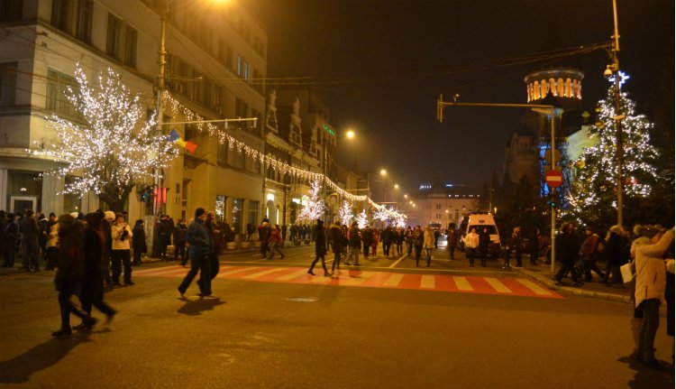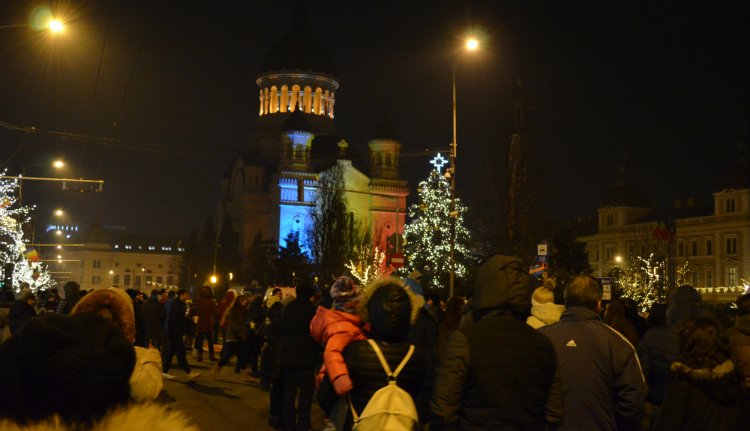 Mikor kiértünk a Bocskai (Avram Iancu) térre, megnyugodva láttuk, hogy az ortodox katedrális az ilyenkor megszokott piros-sárga-kék fényben úszik. A népek csendben gyülekeztek, lehettek olyan ezren, ezerötszázan.