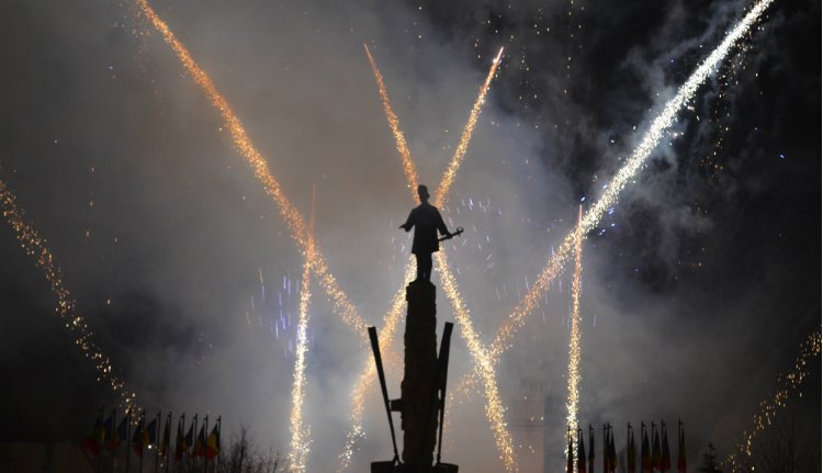 A nemzeti színház felé fordítottuk kíváncsi tekintetünket, és megnyugodva láttuk, hogy az ilyenkor megszokott trikolórok ott vannak a helyükön. Ugyanakkor szívtépően szomorú tárogató hasított a fülünkbe. Mintha nem egyesülést, hanem valamiféle országhalált ünnepelnének itt. Ám a szomorúságot hamar lekeverték, és felharsant Emil Boc multikulturális polgármester hangja, hogy ezen a napon, meg a nagy egyesülés feltétele a kis egyesülés volt, meg Románia erős, meg ortodox, meg ehhez hasonlók. Aztán a kis Boc intett egy nagyot, és felrobbant az ég.