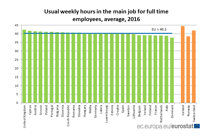 A listát vezeti az Egyesült Királyság 42,3 órával, őket Ciprus, majd Ausztria követi 41,7, illetve 41,4 órával. Dánia az egyedüli ország a listán, ahol az átlagos munkaórák száma egy héten 38 alatt van.