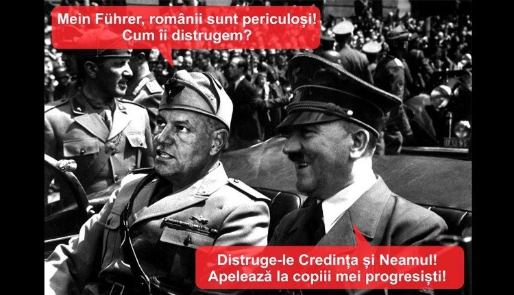 Na de ennek vége. A párt elnöke, Ninel Peia úr olyat nyilatkozott, a párt ideológiai kreatívjai pedig olyat kreáltak, hogy ezt évezredek múlva is emlegetni fogja a párttörténetírás. Úgy gondoljuk, a fenti kép nem szorul különösebb magyarázatra. A biztonság kedvéért azonban lefordítjuk a párbeszédet. Tehát, Iohannis így szól Hitlerhez: „Führerem, a románok veszélyesek. Hogy pusztítjuk el őket?” Hitler pedig így válaszol: „Pusztítsd el Hitüket és Nemzetüket! Fordulj a progresszív gyermekeimhez!” Hă-hă.