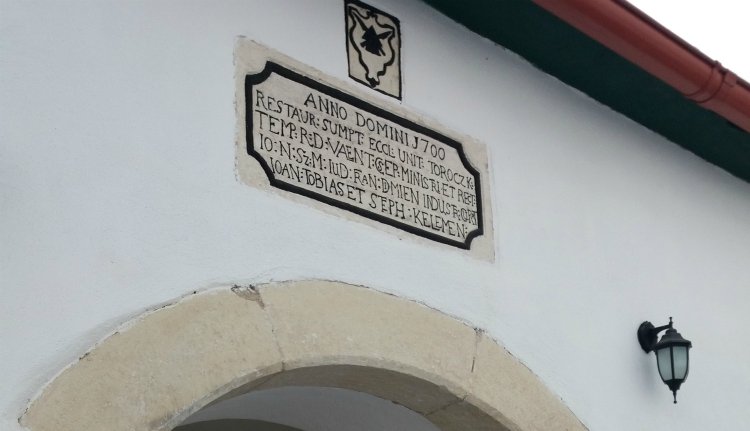 A templomkertbe belépve ennél is régebbi, latin nyelvű szöveg fogad, az 1700-as felújításnak állít emléket.