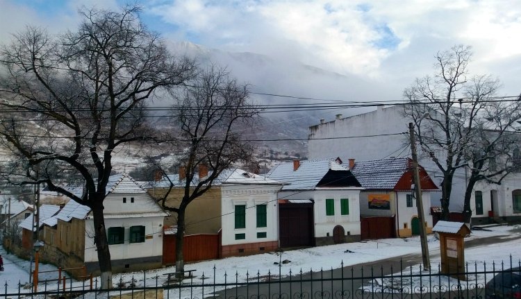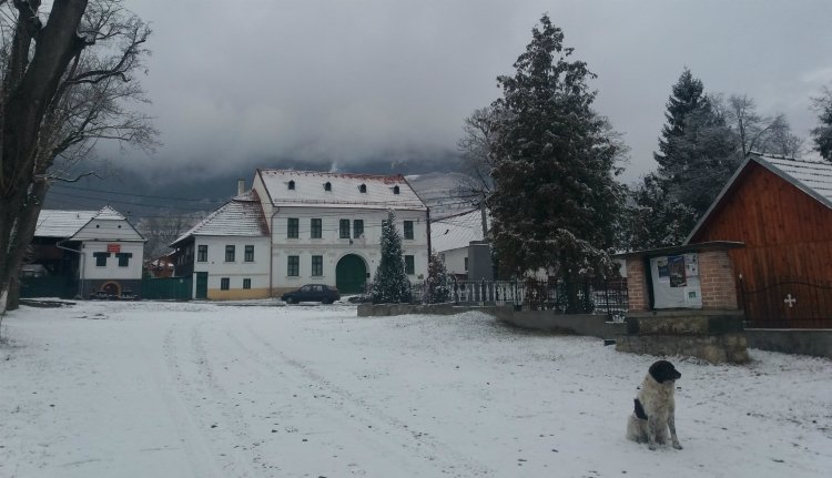 Érkezéskor a falu központjában a szokott látvány fogad, csak épp téli ködbe burkolózva.
