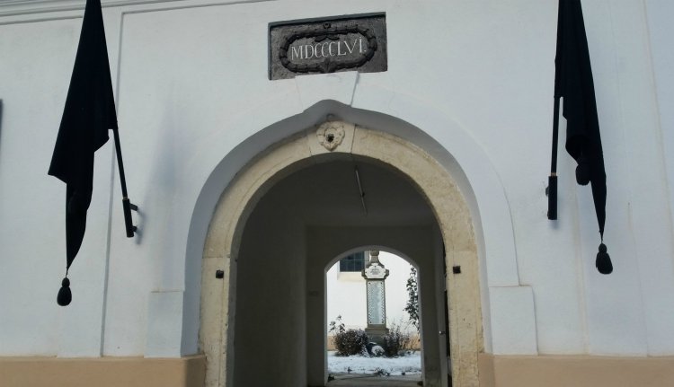 Az unitárius templom kapuján másfajta lobogók, halott van a faluban. 1856 - hirdeti római számokkal a felirat.