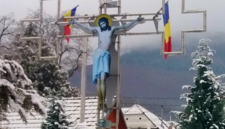 A centenáriumi trikolórokból a feszületre is jutott, a zászlós Jézus lába alatt halálfej is díszeleg.