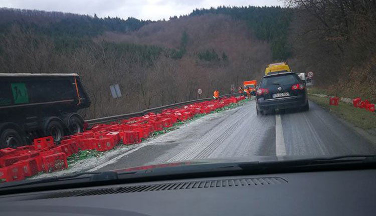 A kora délután bekövetkezett sörapokalipszis miatt bő másfél órán át csak sávonként felváltva lehetett közlekedni Erdély egyik legforgalmasabb országútján, Kolozsvártól mintegy 35 kilométerre. Az aszfaltot a közútkezelő munkatársai tisztították meg.