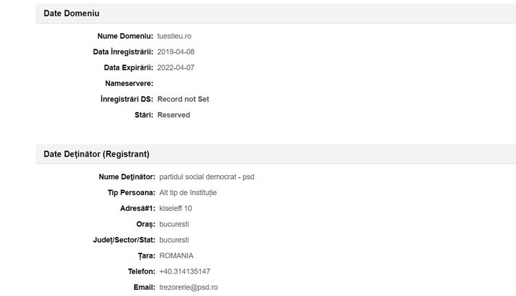 A roTLD-n pillanatok műve lefoglalni egy doménnevet, csak a típusának megfelelő összeget kell befizetni, megadni az adatokat és azt, hogy meddig legyen érvényes a foglalás. A nyilvános adatokból egyetértelműen látszik, hogy a tuestieu.ro weblapcímet a PSD regisztráltatta a hétfői nap folyamán, és 2022-ig őket illeti meg a használat joga.