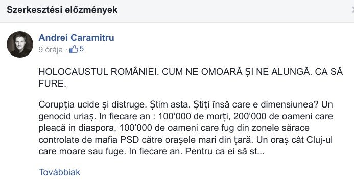 „Míg akkoriban 4-5 év alatt 250 000 halottunk volt (évente 50-60 ezer) (…), most, a PSD miatt 100 000 román állampolgár hal meg autóbalesetekben és az egészségügyi rendszert uraló korrupció miatt” – fogalmazott a pártelnöki tanácsadó. Caramitru időközben rájött, hogy „picit” túltolta a biciklit, és a holokauszt szót népirtásra („genocid”) cserélte. Mit lehet erről még mondani?