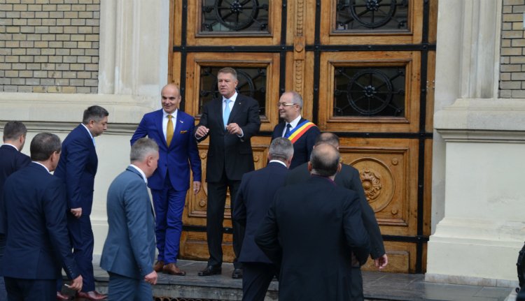 A díszes csapat igen hamar a Babeș-Bolyai Tudományegyetem központi épületének főbejáratához ért, tekintettel az államelnök úr hosszú lábaira. Itt épp az történik, hogy Klaus Iohannis leugrani készül a lépcső tetejéről, mert ő egy sportember. Oké, ez vicc, de megint csak azt tudjuk mondani, hogy az a mozdulat... Ja, tessék megfigyelni Rareș Bogdan úr öltönyének színét. Ilyen hülye kéket már rég nem láttunk. Az úr úgy néz ki, mint egy kék ara papagáj egy csapat jól fésült polgári galamb között.