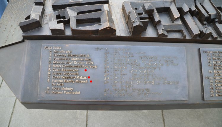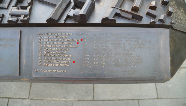 A kitalálók, készítők és engedélyezők méltán lehetnek büszkék magukra: a városközpont bronz makettjére Braille-írással is rávésettek a feliratok, hogy a látáskárosultak is kedvükre tájékozódhassanak. Ez nagyon, de nagyon szép. Na és a magyarok? Tudják, főnök urak, akik itt laknak, ebben a városban, az az ötvenezer. Plusz az itt tanuló diákok. De hát ők tudnak románul, nem? Meg úgyis elfogynak előbb-utóbb. Reméljük, legalábbis. A bronz tovább tart. Na és a turisták? Micsoda kérdés! A turisták nem tudnak románul? Se Braille-ul? Miféle bunkó turista az ilyen. Na, nézzenek Google térképet. Marhák!