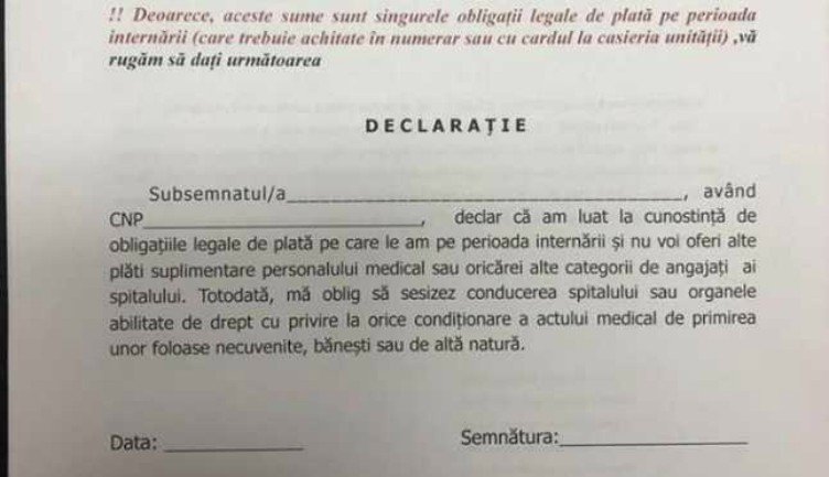 A kórházba beutalt betegeket egy formanyomtatványon tájékoztatják, hogy milyen szolgáltatásokért kell fizetni az intézményben – ilyen például az, ha egy hozzátartozó kéri, biztosítsanak neki fekvőhelyet, hogy egy kiskorú vagy idős beutalt mellett lehessenek (20 lej/nap). A formanyomtatvány mellett egy nyilatkozat is található, melyben a beutalt személyek vállalják, hogy nem adnak pénzt az orvosoknak, illetve az egészségügyi alkalmazottaknak, és kötelezettséget vállalnak arra, hogy értesítik a kórház vezetőségét amennyiben pénzt kérnek tőlük.