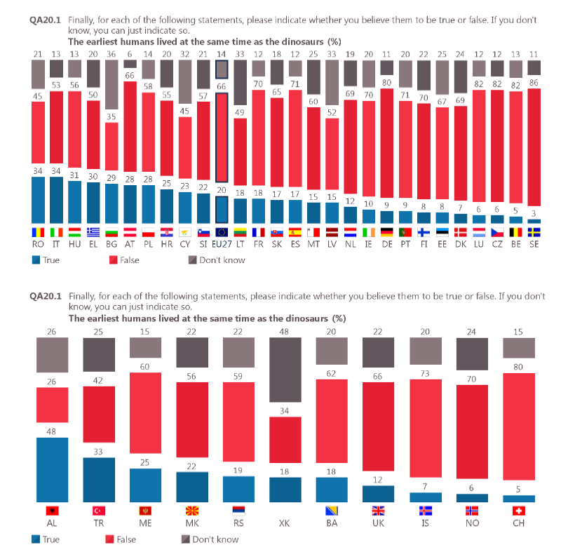 az egész EU-ban itt válaszoltak a legnagyobb arányban – 34 százaléknyian – igennel arra a kérdésre, igaz-e az a kijelentés, hogy az első emberek egy korban éltek a dinoszauruszokkal.