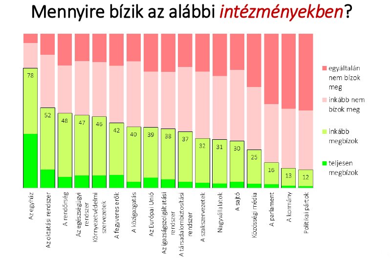 mint erre fentebb utaltam, ebben toronymagasan előzzük a jóval szekulárisabb magyarországi átlagot, de kicsit a romániait is. Aztán, jóval lemaradva, de eléggé bízunk az oktatási rendszerben, a lista végén pedig a politikai pártok, a kormány, a parlament (szóval úgy általában a politikai intézmények) helyezkednek el. A fegyveres erőkben sem bízunk túlságosan, de ez szinte mindegyik európai kisebbségi közösség közös jellemvonása, érthető okokból. (Mi tagadás, mi, a sajtó sem büszkélkedhetünk túl nagy bizalmi indexszel. Hümm, hümm.)