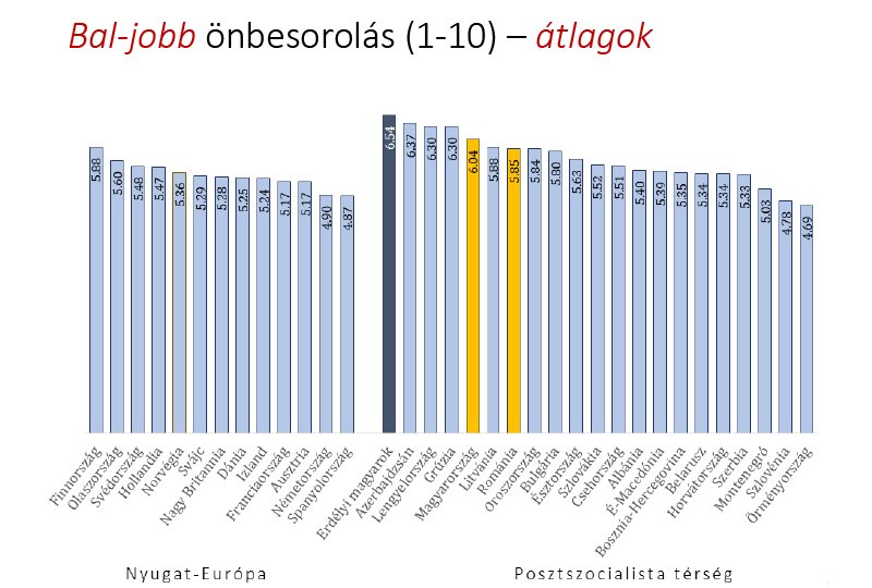 ha lehet hinni a felmérésnek: ez az 1-től 10-ig (balról jobbra) terjedő skálán 6.54 százalékpontot jelent, amivel nemcsak a mérsékeltebb Nyugatot veri toronymagasan, hanem az olyan, relatíve jobbosnak számító országokat is, mint Lengyelország, Magyarország vagy akár Románia. Sőt, meglehetősen magas (16 százalék) azok aránya, akik 10-ből 10 pontra értékelték a saját jobboldaliságukat, ami de facto szélsőjobbnak számít (Romániában és Magyarországon ez az arány egyaránt 11 százalék). Ehhez azonban tegyük hozzá azt is, hogy az erdélyi magyarok körében igen magas azok aránya, főként a magyarországi helyzethez viszonyítva, akik határozatlanok, sehová sem tudják vagy akarják besorolni magukat politikai értelemben.