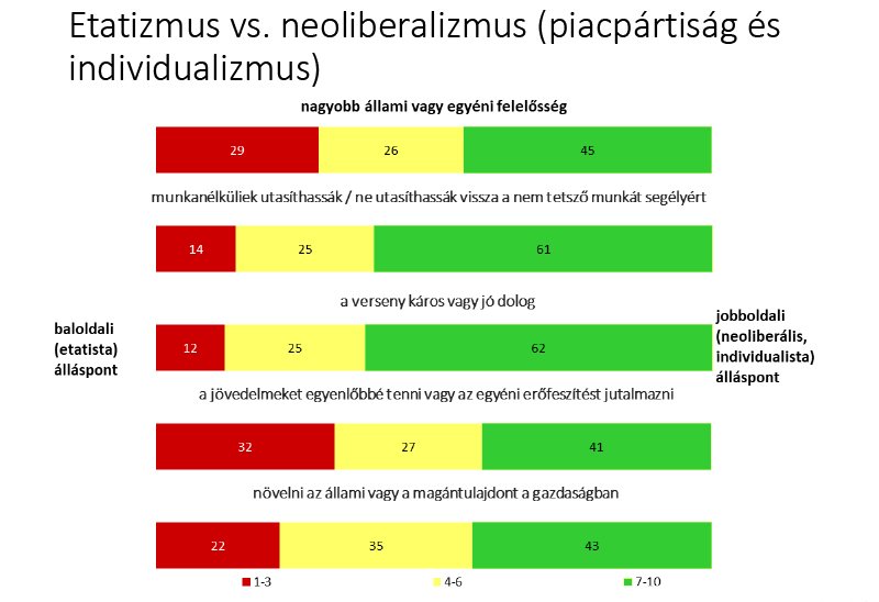 Kérdés persze, pontosan mit értenek jobboldali irányultság alatt a válaszadók: nálunkfelé a politikai identitásnak inkább kulturális tartalma van, mint gazdasági – de a vizsgálat utóbbira is rákérdezett. Nos, az eredmény, bár árnyalja a képet, de lényegesen nem változtat rajta: az erdélyi magyarok nagyobb részt jobboldaliak e tekintetben is, a gazdasági liberalizmus, az egyéni felelősségvállalás, a piaci verseny hívei inkább, mint az állami gondoskodásé vagy az egyenlősítésé (bár utóbbiak tábora sem elhanyagolható).