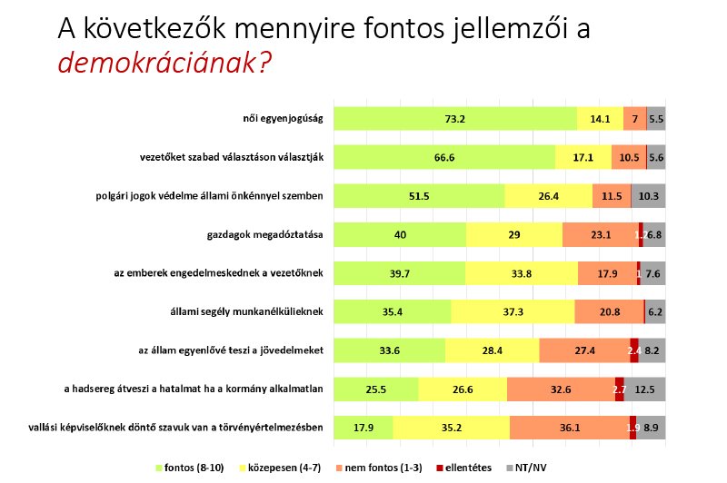 ezt több mint 73 százalékunk gondolja így, megelőzve ezzel a romániai átlagot, de lemaradva a magyarországitól. Ezt a demokrácialistánkon a vezetők szabad megválasztása és a polgári szabadságjogok védelme követi – és bár az olyan, tekintélyuralminak számító nézetek, mint az államnak való feltétlen engedelmesség vagy a hadsereg esetenkénti hatalomátvétele a lista végén kullognak, de az elutasítottságuk nem nagyon erős.