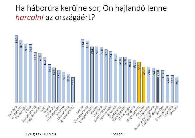 Apropó lelkesedés: a romániai magyarok meghökkentően nagy (43) százaléka valaszolt igennel arra a kérdésre, hogy háború esetén hajlandó lenne-e fegyverrel harcolni az országáért, ez persze elmarad a romániai és magyarországi átlagtól, de akkor is szembeszökő, még az elutasítóak és a határozatlanok nagy száma ellenére is. Az európai kisebbségek közül ebben is csak a finnországi svédek előznek bennünket, a lista végén a litvániai oroszok állnak, őket feltűnően nem fűti semmilyen vágy arra, hogy a baltikumi hazát fegyverrel védjék meg.