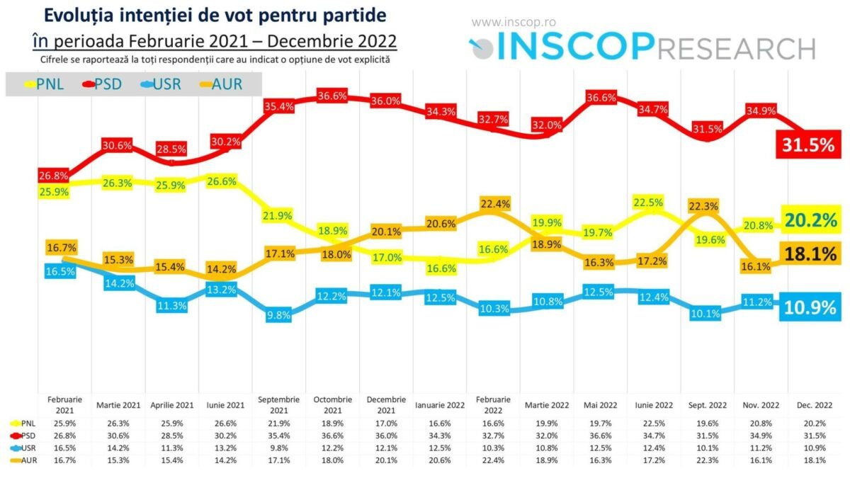 A decemberben készült felmérés adatai szerint egyedül a Románok Egyesüléséért Szövetség (AUR) támogatottsága nőtt decemberben, a kormány vezető erejét adó Szociáldemokrata Párté (PSD), a kisebbik kormánypárt Nemzeti Liberális Párté (PNL) és az ellenzéki, balliberális Mentsük meg Romániát Szövetségé (USR) csökkent a novemberi adatokhoz képest.
