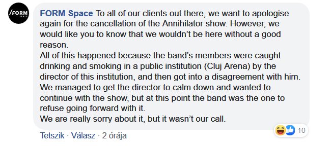 Ezzel szemben az Annihilator közleményében az olvasható, hogy elnézést kérnek a remek kolozsvári rajongóktól, de miután megérkeztek a koncert helyszínére (vagyis a /Form Space-be), a létesítmény tulajdonosa „valamilyen okból” lemondta a koncertet, a zenekarokat (a két előzenekart is) és a stábokat pedig kirakta a helyiségből.