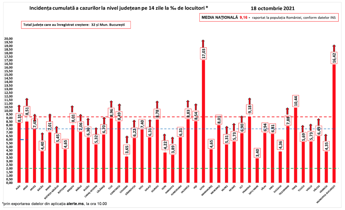 A legtöbb új esetet Bukarestben (2546), illetve Konstanca (678), Temes (569) és Brassó (537) megyében regisztrálták. A lakosságarányos fertőzési ráta minden megyében átlépte a vörös besorolás küszöbét, Ilfov megyében és Bukarestben már 17 ezrelék körül mozog.