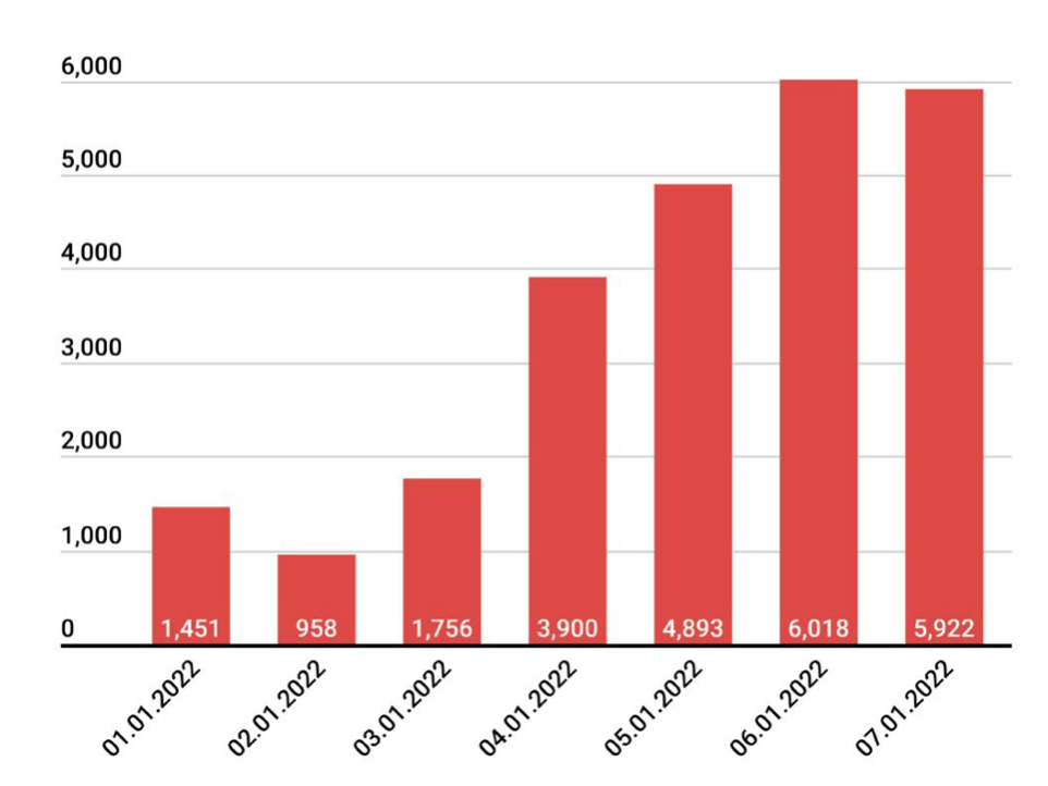 A növekedés már tetten érhető a járványgörbén, január 3-a óta naponta legalább ezerrel nő az újonnan regisztrált fertőzöttek száma. Míg az év második napján 958 esetszámnál tartottunk, négy nap alatt ez hatszorosára ugrott. Pénteken 5922 fertőzöttet vettek nyilvántartásba, kicsivel kevesebbet, mint csütörtökön (6018).