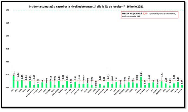 A megyei fertőzöttségi ráták tekintetében sincsenek meglepetések, jelenleg Fehér és Prahova megye áll az élen 0,21 ezrelékkel.