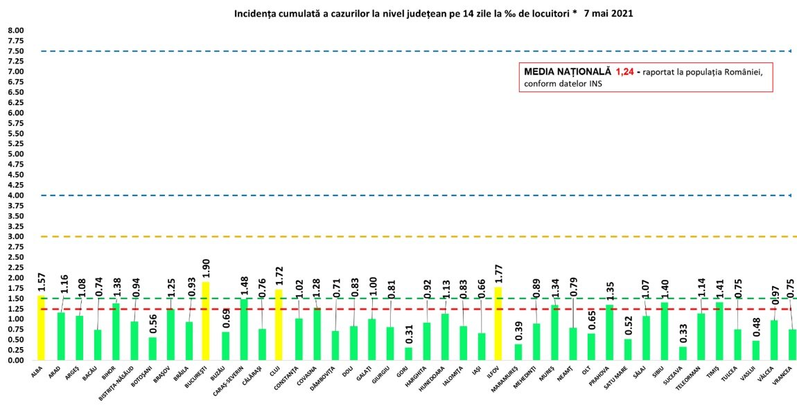 Bukaresten kívül már csak Ilfov, Kolozs és Fehér megye van sárga besorolásban (1,5 ezrelék fölött) a lakosságarányos fertőzöttségi ráta tekintetében (csütörtökön a fővárossal együtt még 5 ilyen megye volt).