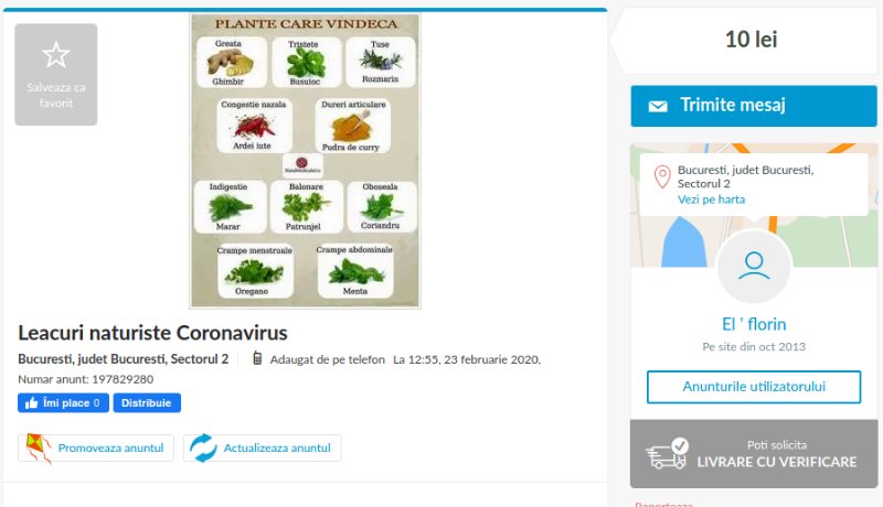 Egy másik eladó hétfői hirdetésében újrahasznosítható koronavírus-védelmi maszkot kínál, EU-szabvány, minden, ami kell, ja, finom és természetes pamutból készültek, teszi hozzá. Ezért is kerülnek 19 lejbe. Az nem világos, hogy egy darab, vagy három.