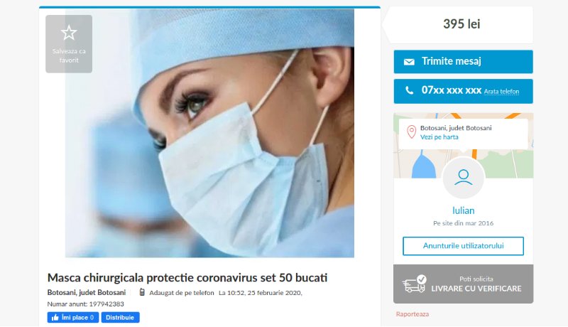 Ez a hirdetés kedden jelent meg. Az eladó azzal reklámozza áruját, hogy hahó, emberek, sokkal olcsóbban adom a cuccot, mint az eMAG, ahol 499 lejbe kerül 50 darab maszk. Én bezzeg csak 395 lejért árulom ugyanazt a portékát. Vagyis csak 7,9 lejért darabját. Ja, és fogy, mint a cukor, már csak négy dobozom maradt!
