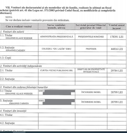 Amely szerint az elmúlt évben mind Klaus Iohannis, mind a Nagyszebenben angoltanárnőként dolgozó Carmen Iohannis jövedelme szinten maradt: előbbi 178 391, utóbbi 44 861 lejes jövedelemről számolt be.