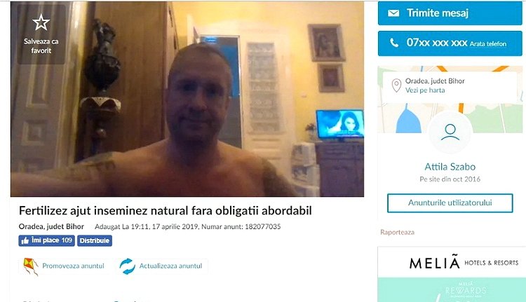 Na, valaki, esetleg? Persze, kicsit elkésik az illető hölgy, ha pénteken kattint az olx.ro-ra. Ugyanis az történt, hogy a szemfüles váradi sajtó is felfigyelt a hirdetésre, és felkereste Szabó urat. Nyilván nem inszeminációs céllal. A Megtermékenyítőt persze kellemetlenül érintette a nem kívánt nyilvánosság, hiszen ő épp az ellenkezőjét kívánta volna (diszkréció, ki is írta). Így aztán morgott egyet, és leszedte a hirdetést, azzal, hogy ha már ilyen felhajtás van körülötte, akkor átvonul egy diszkrétebb hirdetési oldalra.