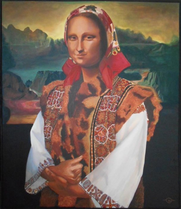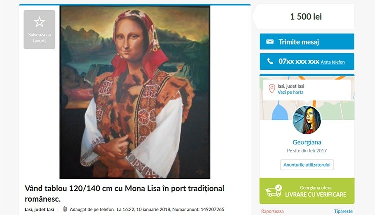 Ezt a gyönyörű, román parasztasszonyi viseletben ábrázolt Mona Lisát árulja egy Georgiana nevű iaşi-i felhasználó az OLX-en.