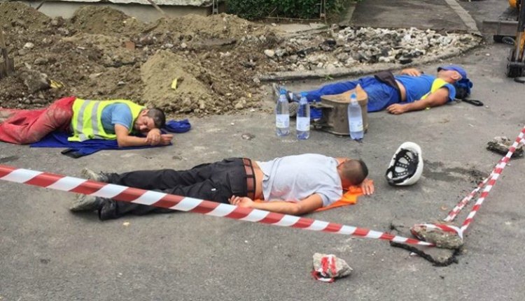 Ez nem egy művészi performansz vagy egy társadalmi célú figyelemfelkeltő akció, hanem „csak” három aszfaltozó munkás Temesváron, akik a kiásott gödör mellett hajtották álomra a fejüket. A fotót egy temesvári Facebook-oldalra töltötték fel, de hamar virálissá vált.