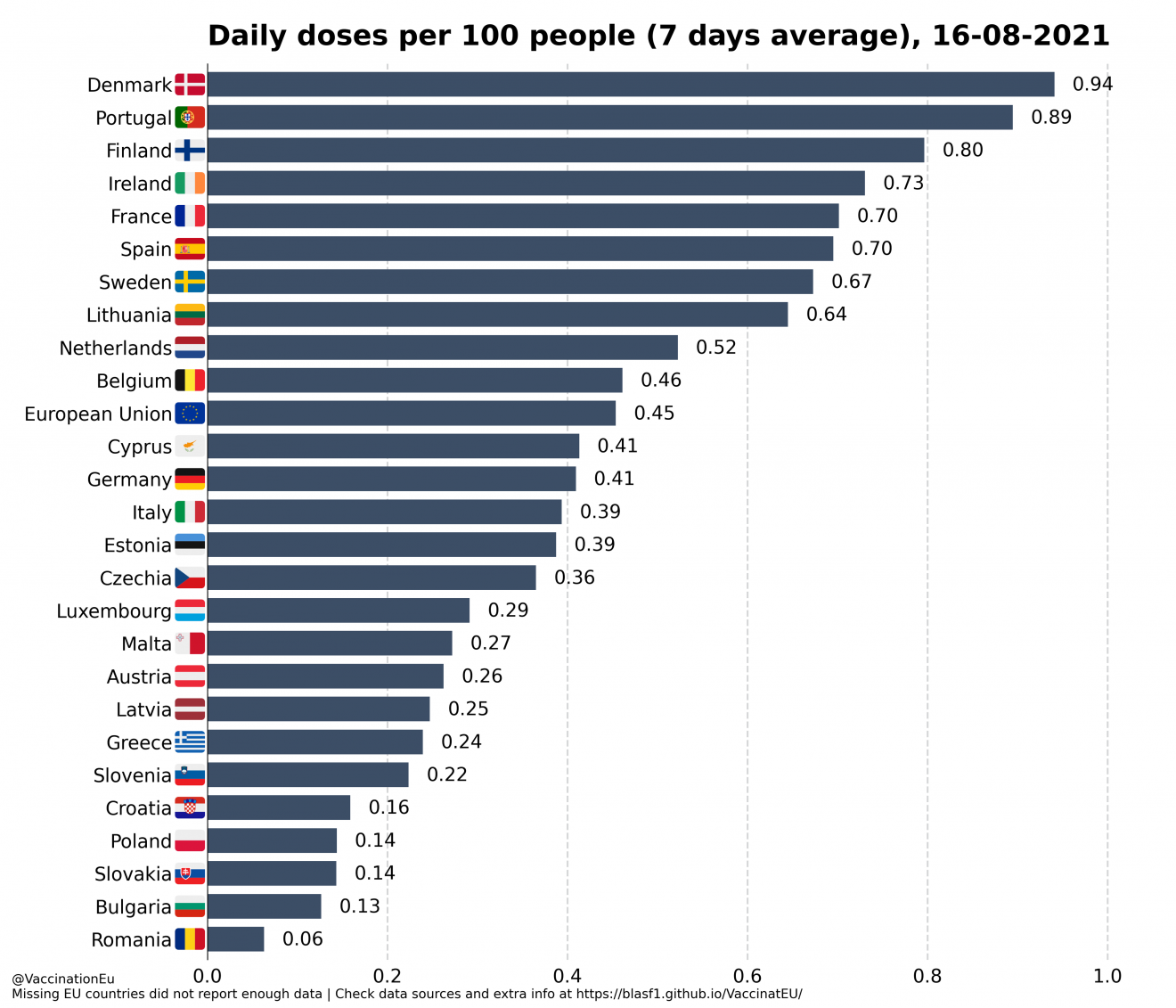 A VaccinationEU Twitter oldalon közzétett legfrissebb infók szerint az eddig beoltott lakosok arányát tekintve még nem is a legutolsók, „csak” az utolsó előttiek vagyunk, Bulgária ugyanis nálunk is rosszabbul áll.