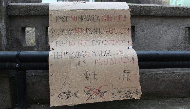 A jelenség sokakat foglalkoztat, ezt igazolja a magyar színház sétatéri épülete mellett a napokban lefotózott többnyelvű tábla is, mely arra figyelmeztet: a halak nem esznek szemetet. Tényleg nem!
