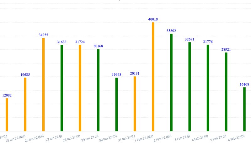 Ötödik napja csökken az új koronavírus-esetek száma, a február elsejei 40-ezernél is több napi eset után vasárnap 16 108 új megfertőződést regisztráltak – derül ki a hivatalos adatokból.