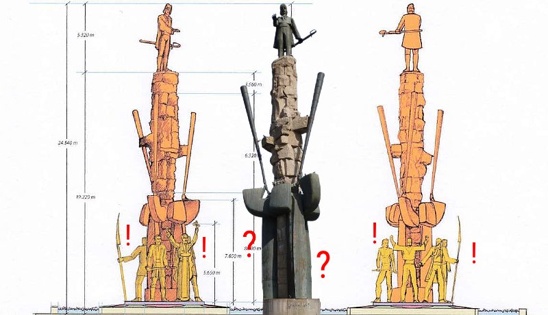 Sokan felkaphatják erre a fejüket: miért, hát nincs készen az a mű (függetlenül attól, hogy szép vagy csúf)? Hát, nincs. A szobor megalkotója, Ilie Berindei topánfalvi születésű, ám 1982 óta Svájcban élő szobrász elmondta, hogy anak idején nem úgy tervezte a szobrot, ahogy most kinéz. 1993-ban, amikor a szobrot felállították, egy részére egyszerűen nem volt pénz. Pedig az alkotás állami támogatásból és magánadományokból készült, ráadásul feltehető, hogy a város akkori polgármestere, a szélsőséges nacionalista Gheorghe Funar minden követ megmozgatott a szükséges összeg előkerítése érdekében. De nem ment, és ha nem ment, hát úgy döntöttek, felállítják a szoborrészletet, üsse kő, aztán majd lesz valahogy. Érdekes eljárás ez. Berindei úr arról nem beszél, miért egyezett bele az eleve csonka alkotás felállításába, ami azért nem fordul elő olyan gyakran. Persze, azt is tudjuk, hogy ha egy szobrot egyszer felállítanak, nehezen lehet később eltávolítani.