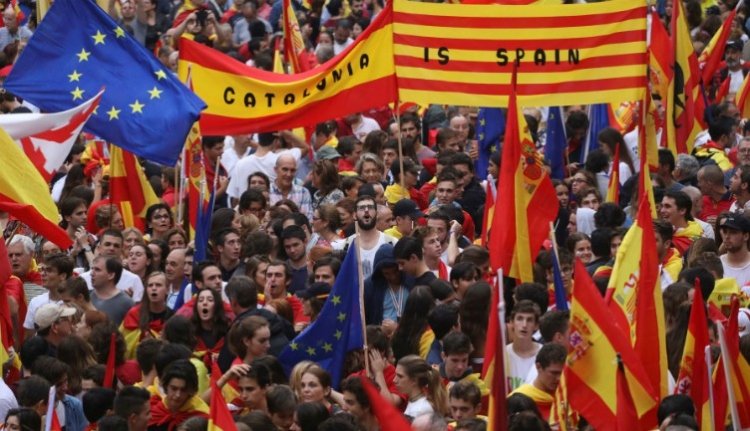 „Spanyolország az Katalónia, Katalónia az Spanyolország” – skandálják a népszavazást ellenző spanyolok.