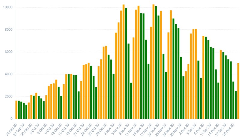 Az utóbbi 24 órában 5 009 új koronavírus-fertőzést regisztráltak. Ez 23 834 tesztből jött össze, ami elég kevés a korábbi 30-35 ezres szinthez képest. Ennek ellenére a napi új esetek számának csökkenése egyértelmű.